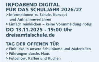 Infoabend Digital für das Schuljahr 2026/27 Informationen zu Schule, Konzept und Aufnahmeverfahren Einfach reinklicken - keine Voranmeldung nötig! DO 13.11.2025 [...]